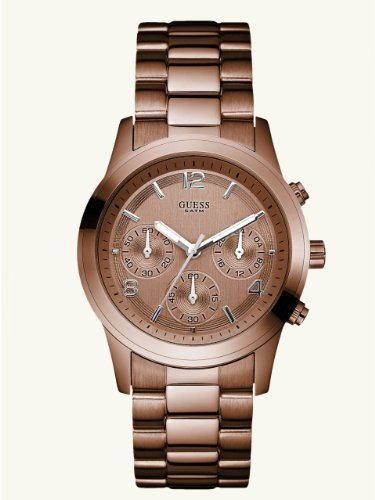 GUESS? , With an eye-catching gold tone and bold boyfriend design, we can't get enough of this season's hottest watch. Snag yours before we run out! ? Chronograph watch: stopwatch function, 24 hour international time and date ? Watch dimensions in mm: 39/39/12 ? Polished bronze-tone case ? Bronze-tone dial ? Polished bronze-tone steel bracelet ? Water resistant up to: 100 m/330 ft ? 10 Year Limited Warranty Women's Accessories > Watches > Metal